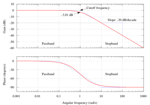 De waarden veranderen wel niet plots. Ze veranderen gradueel. Omdat het hier een voorbeeld is van een laag-doorlaatfilter, gaat de amplitude van hoog naar laag, en staat op -3dB op de filterfrequentie.