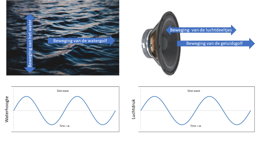 Als we deze uitzetten in een grafiek waarbij we de luchtdruk (geluid) of we hoogte (watergolf) uitzetten in een grafiek, zien deze er hetzelfde uit. Daar kan je geen verschil zien.